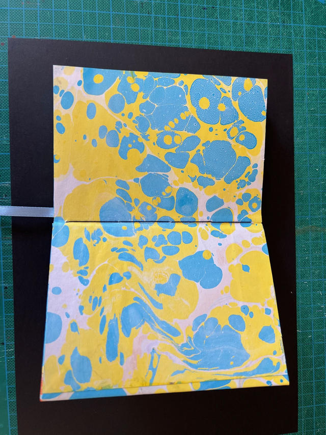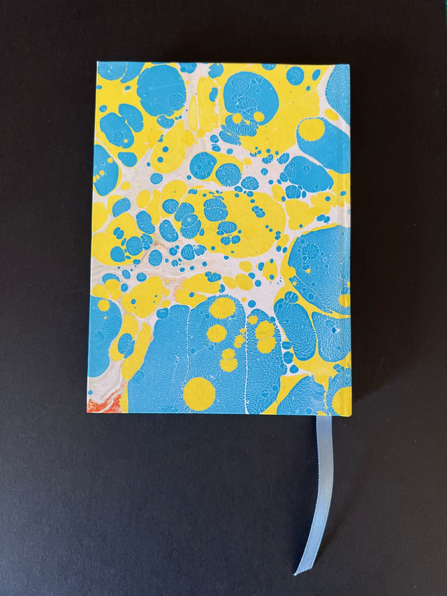 Carnet cartonné de 160 p (papier blanc, 90gr). taille : 10.4 x 14.5 cm. Tranche décorée. Avec ruban marque page. Couleur dominante de la marbrure : bleu, jaune (frais de port compris) Attention, cet article est unique - n'en commander qu'un seul