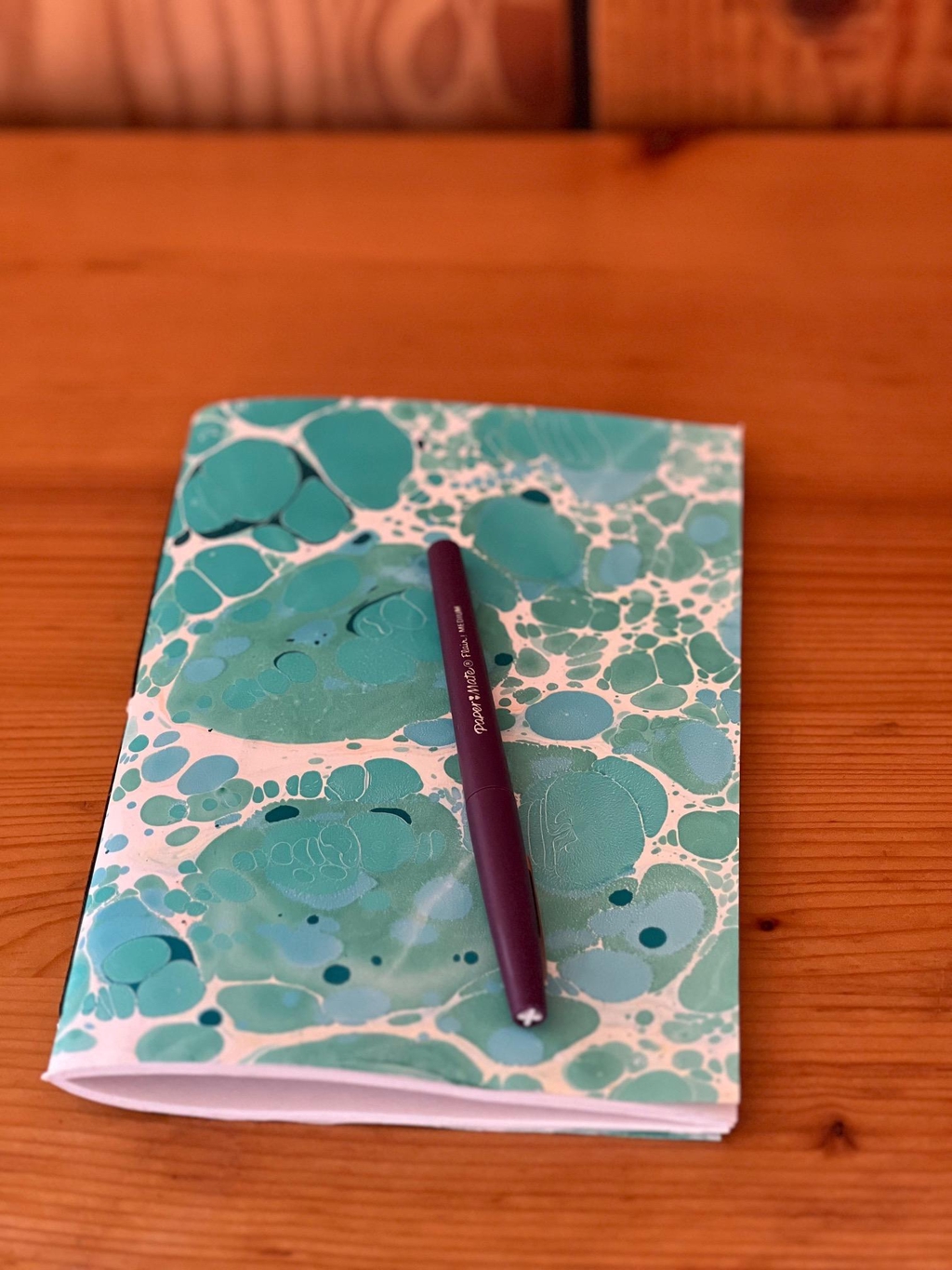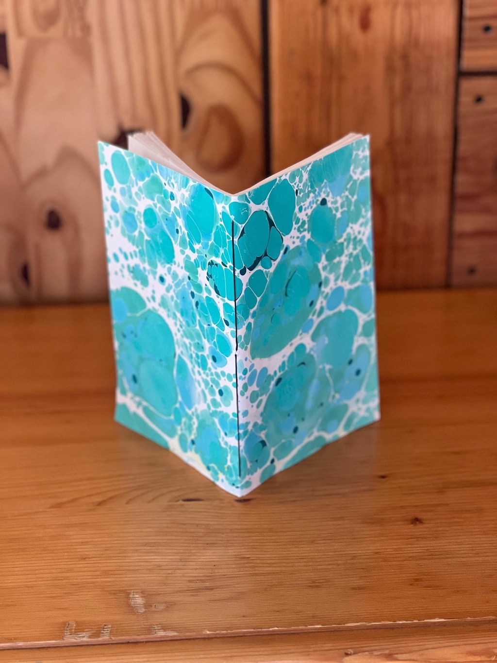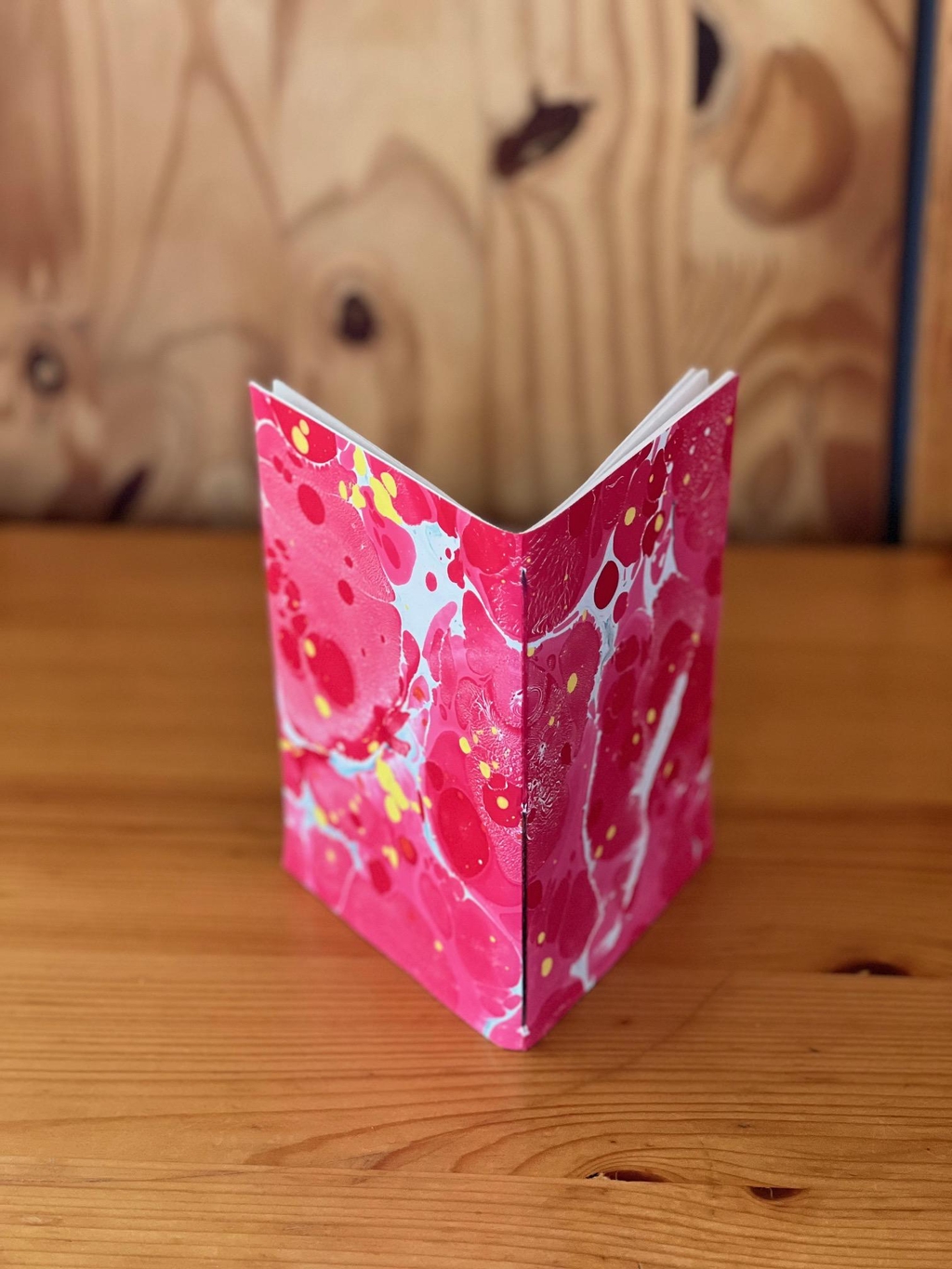 Ce petit carnet est une pièce unique. Sa couverture est réalisée à partir d’une technique inspirée de l’ébru. Les motifs obtenus rendent ce carnet différent de tous les autres. Les feuilles de papier sont reliées à la main avec du fil de cuir ciré.