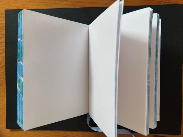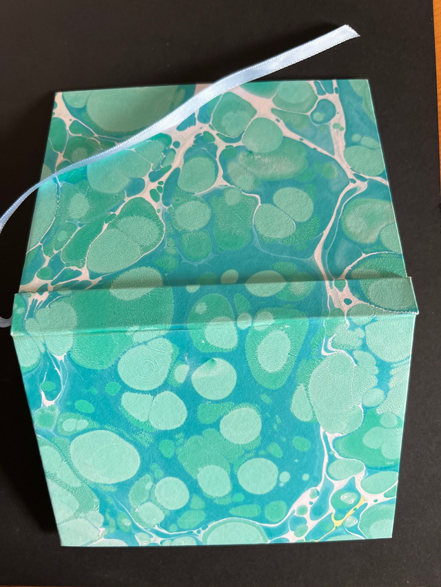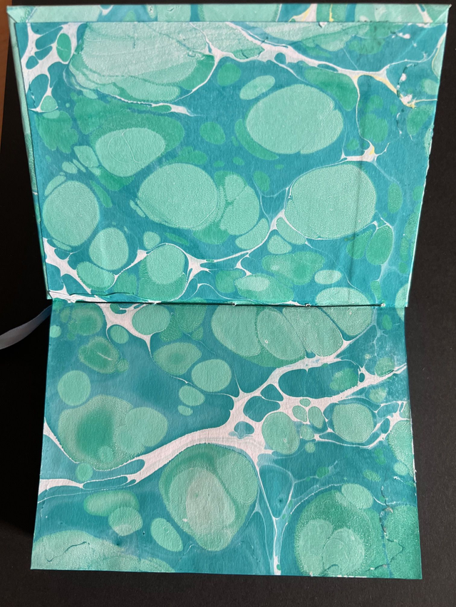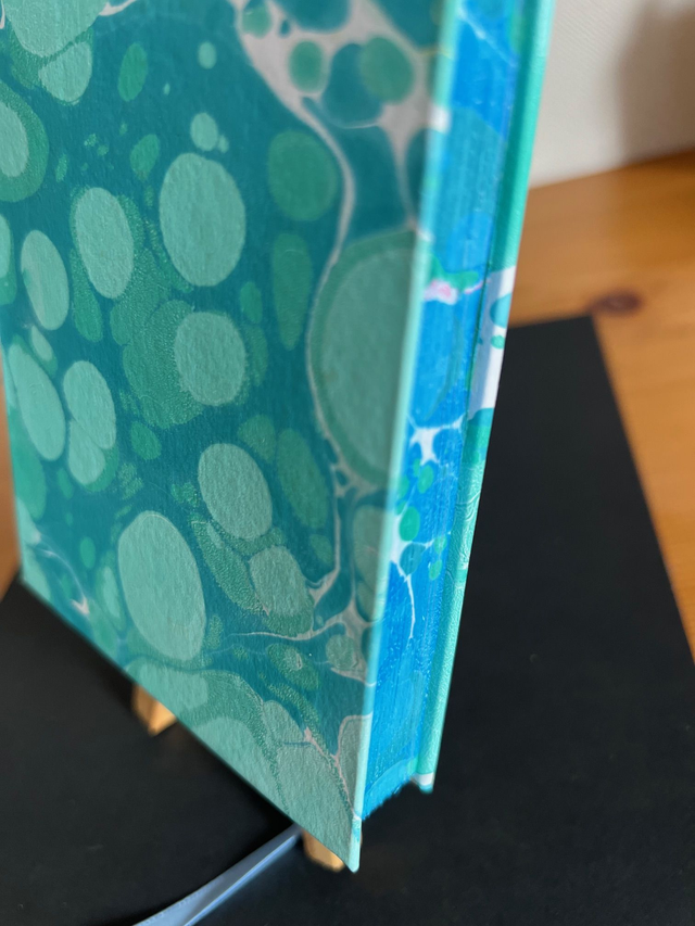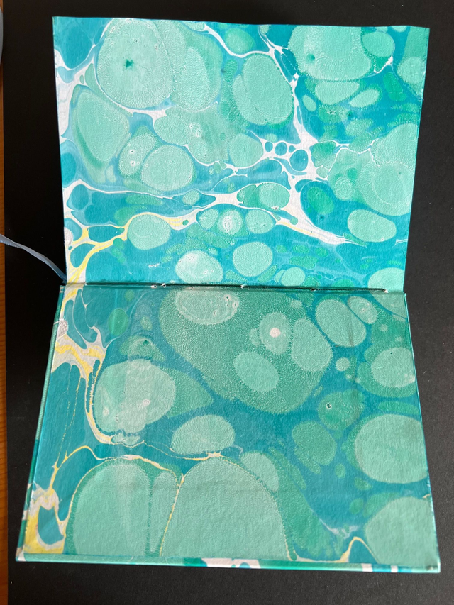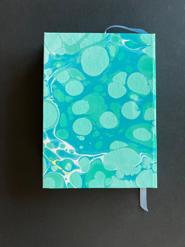 Carnet cartonné de 160 p (papier blanc, 90gr). taille : 10.6 x 14.6 cm. Tranche décorée. Avec ruban marque page. Couleur dominante de la marbrure : vert, bleu (frais de port compris) Attention, cet article est unique - n'en commander qu'un seul